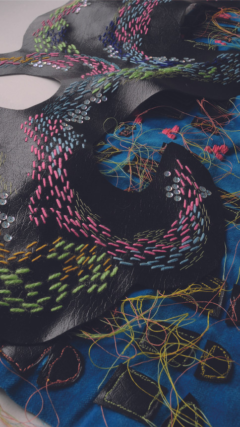 The inspiration behind my Major Project came from the concept of ‘Broken and Mended.’ The project’s imagery came from my research into the Japanese art of Kintsugi, broken skin and scar tissue, and the way in which fabric can be damaged and repaired. I wanted to create a project which showcases the beauty of the imperfect. I used this collection to show my passion of colour by using a combination of metallics, bright hues and some more neutral tones.